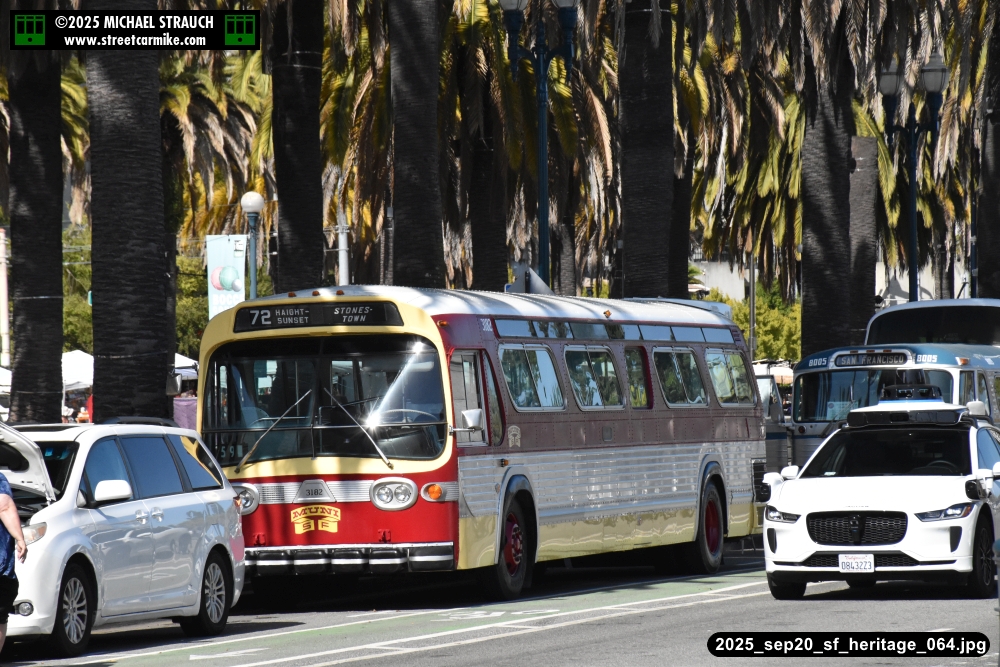Also seen parked on Embarcadero were privately owned Muni 3182, VTA 9911, and the Pacific Bus Museum's