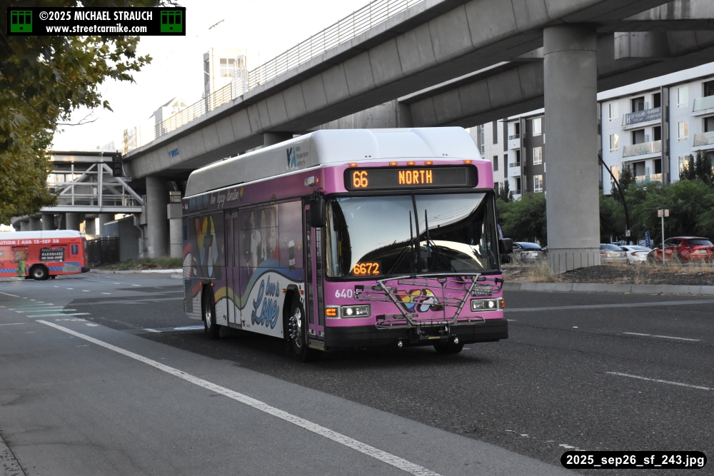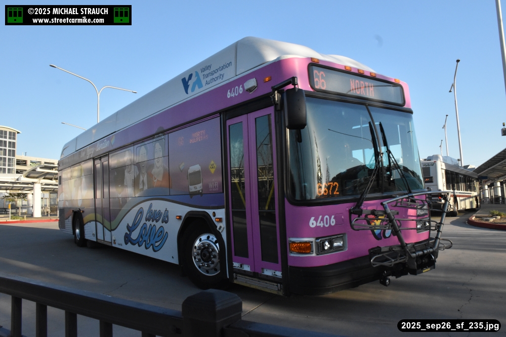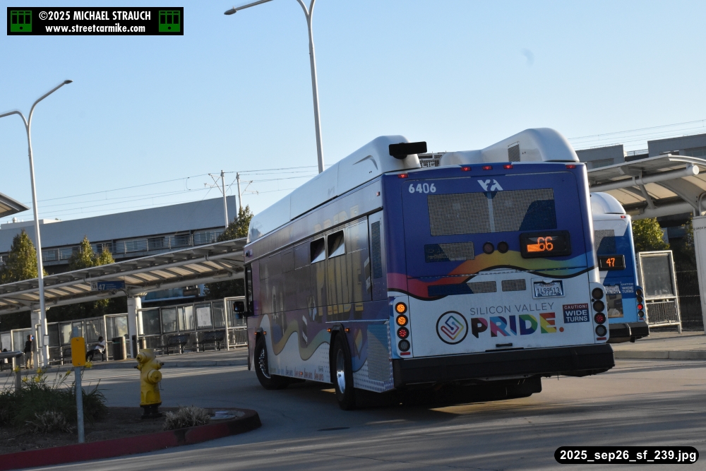 to my parked car at Milpitas Station. VTA Gillig 6406 in Pride livery was coming north on the 66,